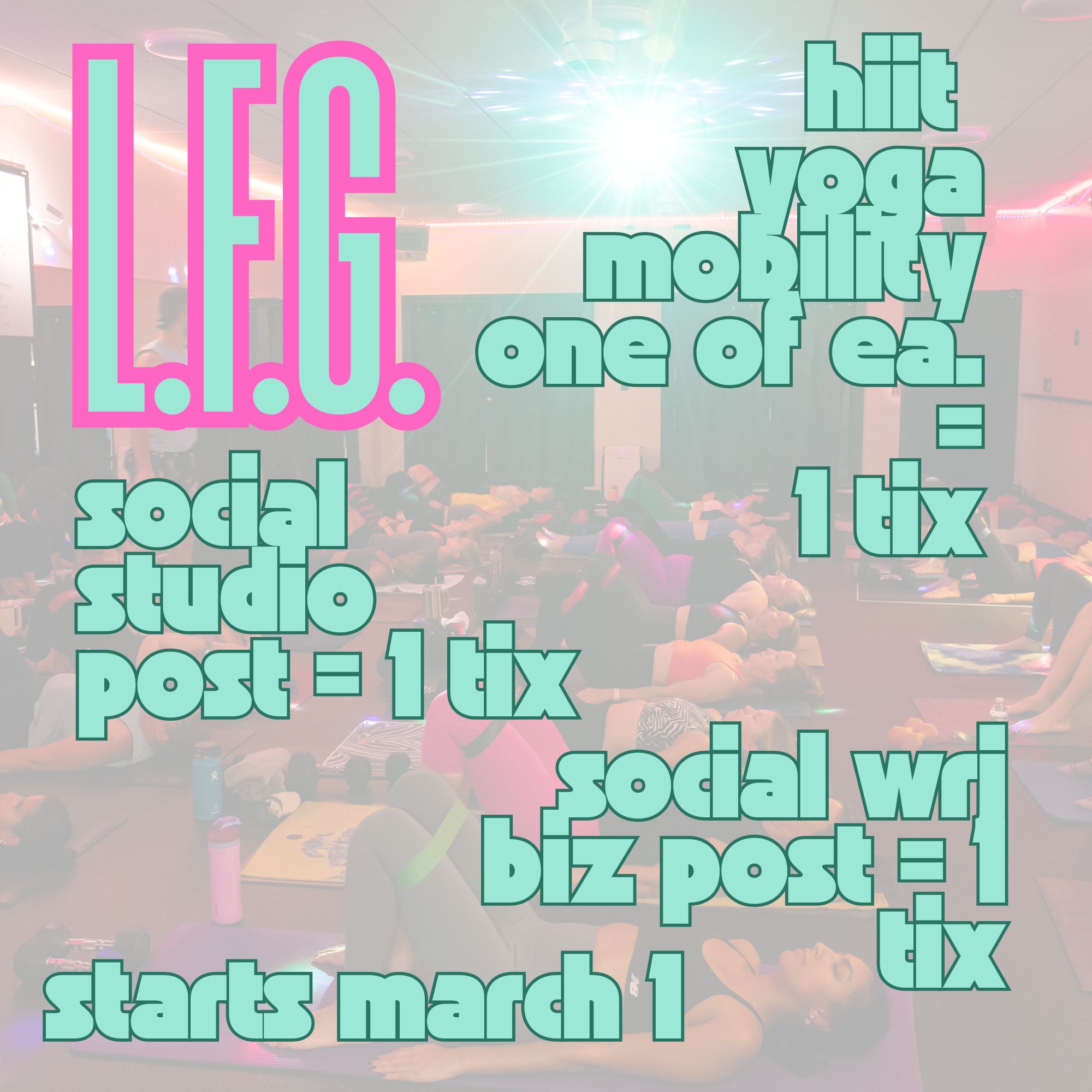 Join our LFG March Studio Challenge starting on March 1! Through March 28th, sign up to take each type of class- Mobility, HIIT, & Yoga- each week and get a ticket to win a Studio Prize Pack.